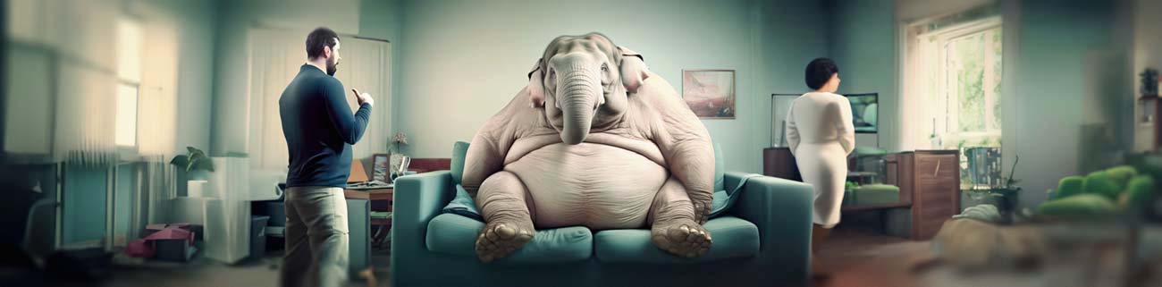 ʼn Olifant is ʼn dier. ʼn Groot dier. ʼn Baie groot dier. ʼn Olifant is ʼn massiewe dier wat soms reg in die middel van die vertrek kom staan met jou in die een hoe ken jou maat in die ander hoek wat kommunikasie tussen julle blokkeer met sy groot, logge lyf. Soms gee ons voor dat die olifant nie daar is nie en soms hoop ons dat die olifant vanself weg sal gaan. Maar die olifant gaan net nie weg nie. In ons poging om konflik te vermy, ontken ons die olifant en bly die olifant daar tussen jou en jou maat staan.