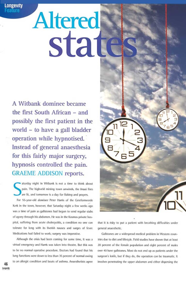 In die loop van 1999 het my pa ‘n galsteenverwyderingsoperasie ondergaan maar in plaas van narkose het hy van hipnose gebruik gemaak. Sy verhaal is gepubliseer in die Longevity Magazine, wat ek aan die einde van hierdie artikel sal plaas met die vriendelike vergunning van Longevity Magazine.