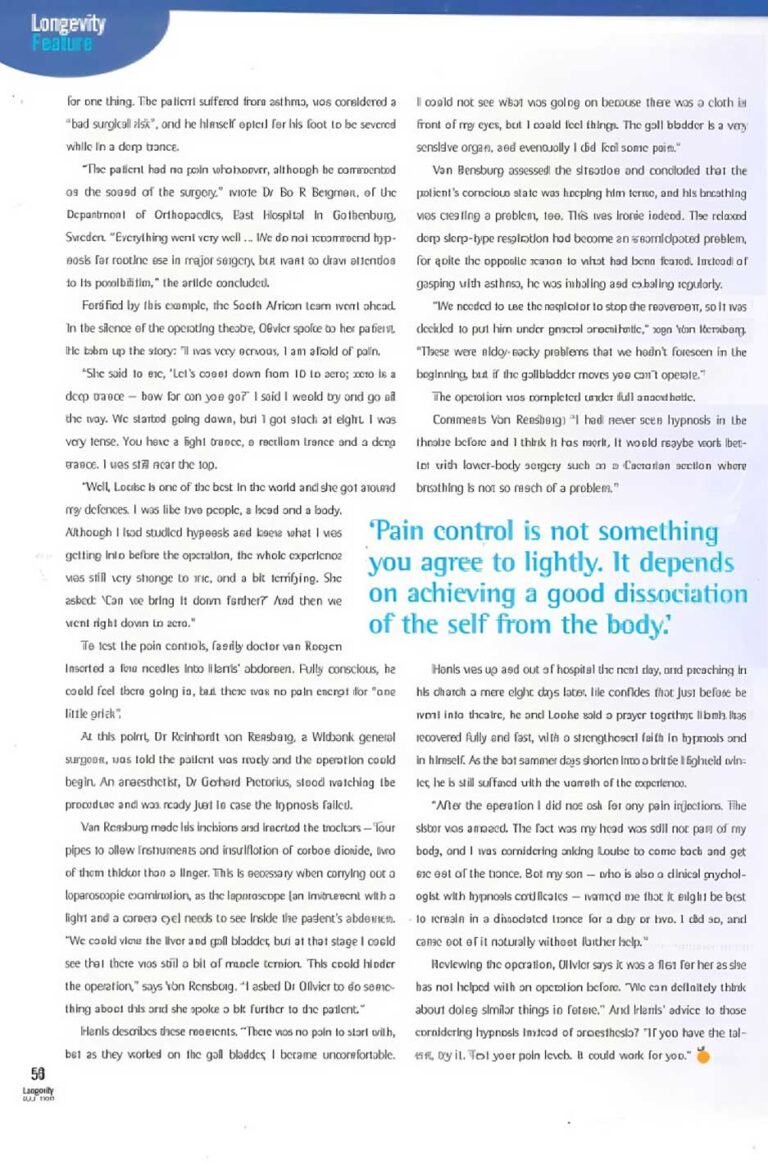 During the course of 1999, my dad had a gallstone removal surgery without any anaesthesia, but with the use of hypnosis instead of anaesthetics. Making medical history, his story was published in the Longevity Magazine, which I will publish at the end of this article with the friendly courtesy of Longevity magazine.