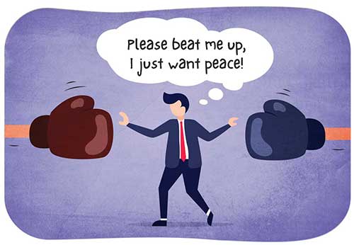 We might want to back off and settle for less to avoid the pain of standing our ground. Also, to keep the peace between different parties, e.g. when someone wants to arrange a surprise party for someone who despises it, you will compromise by making another proposal that accommodates both parties, most often to your own detriment, since both parties may be cross with the peacemaker.