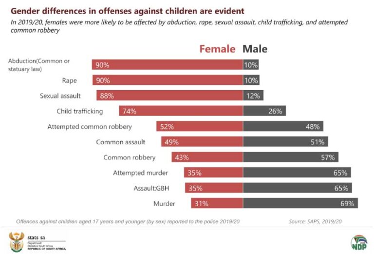 The 2019/2020 Annual Crime Statistics presented by the South African Police Service (SAPS) early 2024 showed that more than 24 000 children were sexually assaulted in South Africa during that period. One in five children are victims of sexual abuse, representing 19.8%, compared to a global average of 18% for girls and 8% for boys.