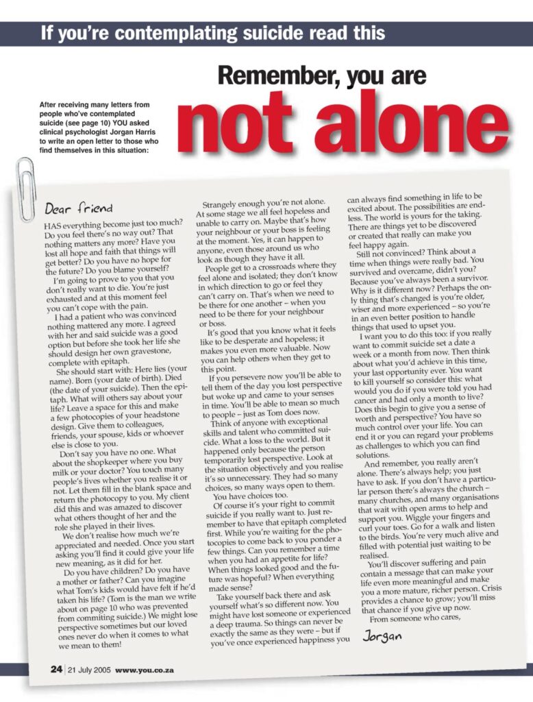 In an attempt to convince the suicidal ones otherwise, I published an open letter for them in YOU-magazine, published below courtesy of YOU-magazine.